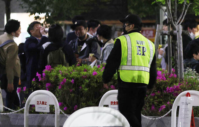 多くの人が集まった新橋駅近くの公園では、警備員(左手前)が密を避けるよう呼び掛けていた=2021年4月16日午後8時24分、東京都港区 写真提供:時事通信社