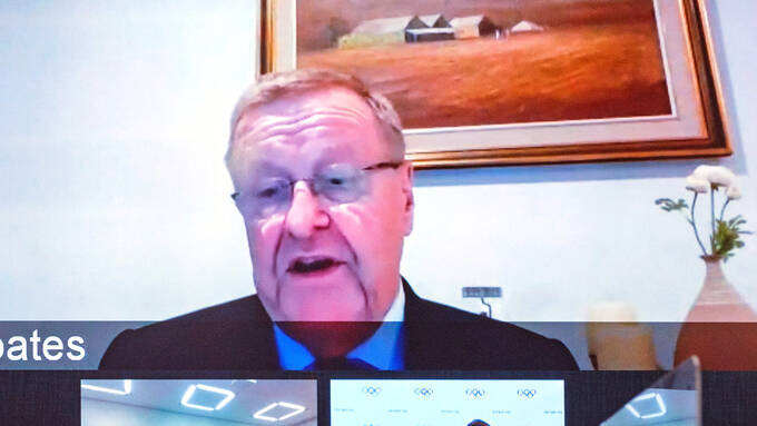 国際オリンピック委員会(IOC)と東京五輪・パラリンピック組織委員会の合同記者会見。モニター内にIOCのジョン・コーツ調整委員長=2021年5月21日、東京 EPA/Nicolas Datiche / POOL EPA=時事 写真提供:時事通信社