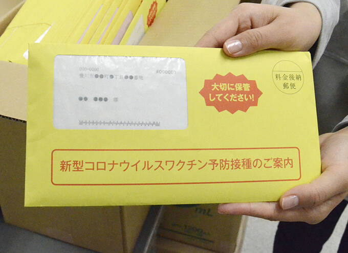 ワクチンの高齢者優先接種に向け、愛知県豊川市が発送準備を進めている接種券やチラシが入った封筒=2021年3月23日 写真提供:共同通信社