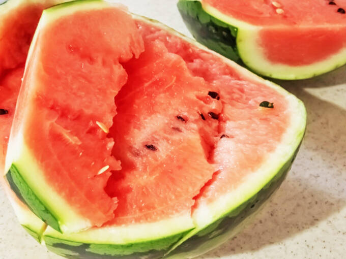 スイカの皮は緑色ですが、これは光合成を行う色素・クロロフィルからできています。1984年(昭和59年)から生産が始まった北海道・当麻町の「でんすけすいか」のように、皮が黒っぽいスイカもあります。