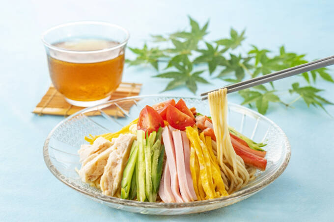 辞書で「冷やし中華」を調べると、「茹でて冷やした中華麺の上に千切りの錦糸卵やハム、またはチャーシュー、キュウリ、クラゲ、蒸し鶏、紅ショウガなどの具を並べ、お醤油と酢のタレ、またはゴマ風味のタレをかけた料理」とあります。確かに冷やし中華と聞くと、このイメージが一般的です。