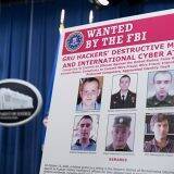 米司法省の記者会見で提示されたロシア軍参謀本部情報総局(GRU)のハッカー6人の写真=2020年10月19日、ワシントン(ゲッティ=共同) 写真提供:共同通信社