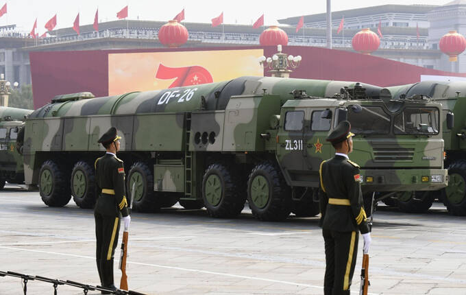 中国建国70年の軍事パレードに登場した中距離弾道ミサイル「東風26」=2019年10月、北京の天安門前(共同) 写真提供:共同通信社