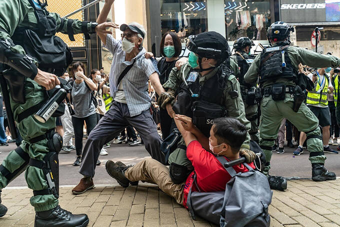 27日、香港のデモで、取っ組み合いになる警官隊とデモ支援者(ゲッティ=共同)=2020年5月27日 写真提供:共同通信社