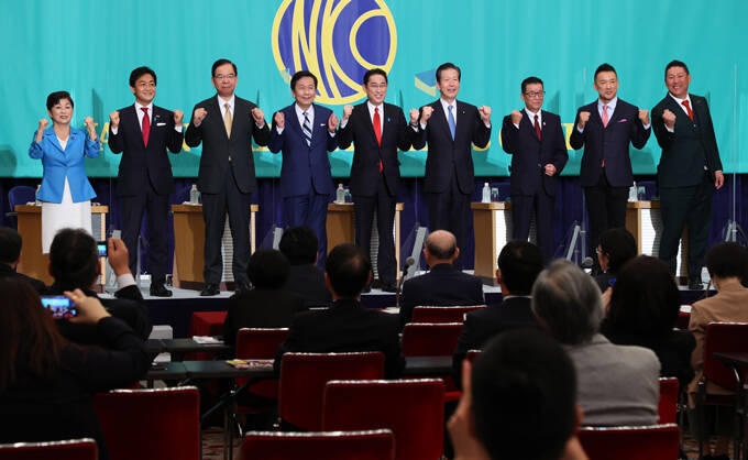【衆院選2021 9党党首討論会】党首討論会に臨む9党の党首 (左から)社民党の福島瑞穂党首、国民民主党の玉木雄一郎代表、共産党の志位和夫委員長、立憲民主党の枝野幸男代表、自民党総裁の岸田文雄首相、公明党の山口那津男代表、日本維新の会の松井一郎代表、れいわ新選組の山本太郎代表、NHK党の立花孝志党首=2021年10月18日午後、東京都千代田区 写真提供:産経新聞社