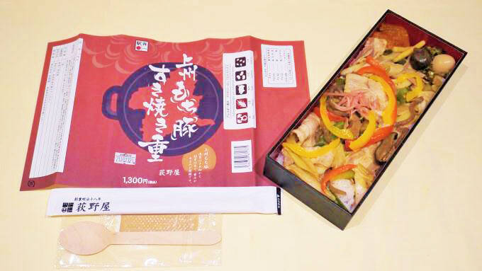 碓氷峠と言えば「峠の釜めし」でおなじみ、駅弁屋さんの「荻野屋」。その荻野屋から登場した新作が「上州もち豚すき焼き重」(1300円)です。豊かな自然に恵まれた群馬県では、全国トップクラスの豚肉、こんにゃく芋は全国の約9割、下仁田ネギ、椎茸、白菜、春菊などの生産が盛ん。すき焼きの食材がすべて県内産で賄えることから、平成26(2014)年には「すき焼き応援県」を宣言しています。荻野屋では今回、群馬県が「すき焼き応援県」であることをもっと知ってもらおうと、新たに駅弁を開発したと言います。