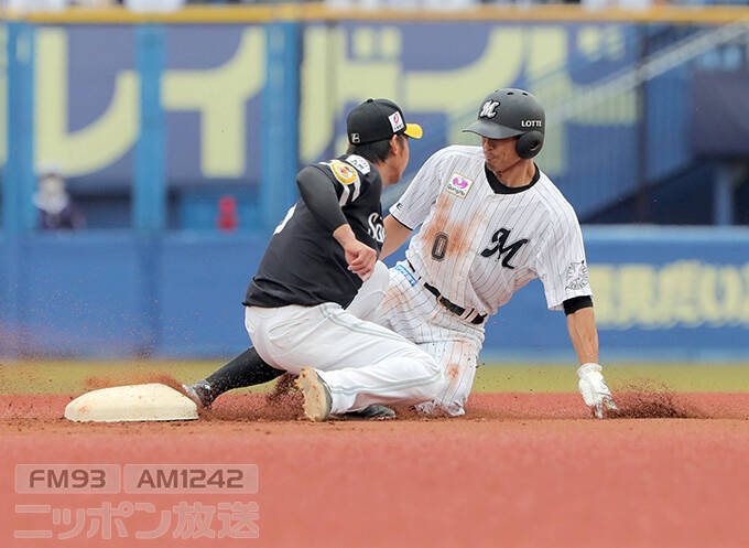 【プロ野球ロッテ対ソフトバンク】1回 二盗に成功するロッテ・荻野貴司=2021年10月16日 ZOZOマリンスタジアム 写真提供:産経新聞社