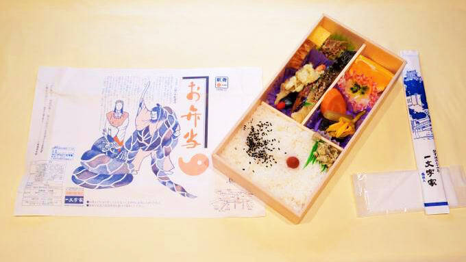コシヒカリの濃いめの味を堪能するなら、やっぱり、幕の内弁当の白いご飯がいちばんです。一文字家の幕の内は、出雲らしさを感じさせる「勾玉(まがたま)」(980円)という名前です。十字のゴム紐で留められている昔ながらの掛け紙には、奥出雲のヤマタノオロチ伝説にまつわるイラストとともに、詳しいエピソードが記されていて、駅弁をいただく際のいいお供になってくれます。