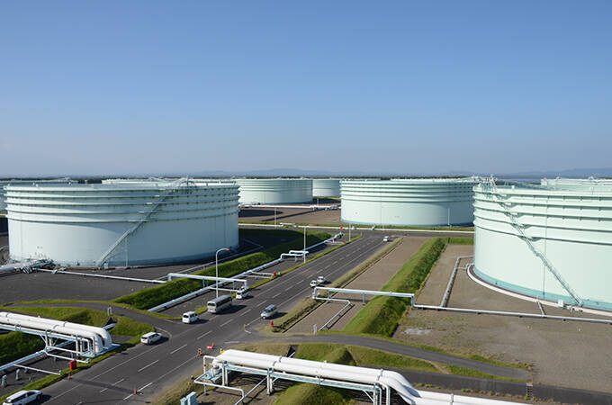 志布志国家石油備蓄基地 備蓄タンク群と防油堤(鹿児島県肝属郡串良町) 撮影日:2011年10月25日 写真提供:時事通信社