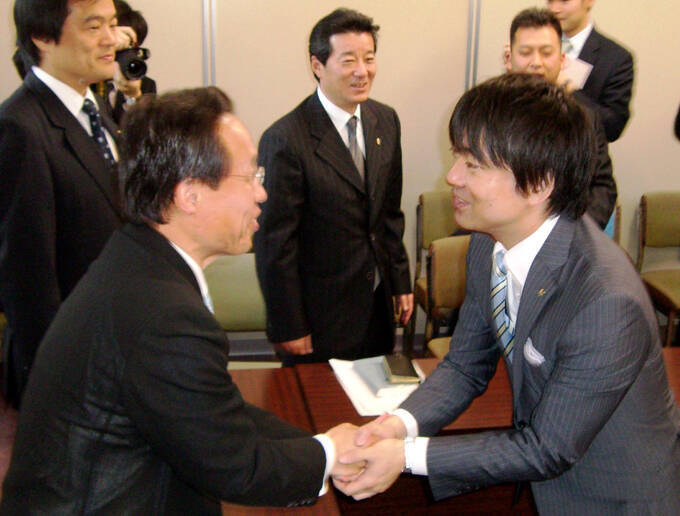 若手の自民府議6人が新会派結成「自民党・維新の会」のメンバーたちと握手を交わし、エールを送る橋下徹・大阪府知事 =2009年4月24日午後4時14分、大阪府庁 写真提供:産経新聞社
