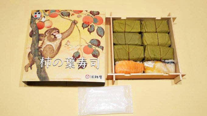 生瀬駅で構内営業をしていた時代、武庫川の鮎を使った「鮎寿司」が名物だった淡路屋。残念ながらいま、鮎寿司の販売はありませんが、創業時からの「寿司へのこだわり」を惜しみなく注いだという新作駅弁が、今年(2021年)11月20日に登場しました。その名も、ズバリ「柿の葉寿司」(1200円)。枡形の折箱に載せられた掛け紙には、柿の木と猿の絵が描かれていて、まるでむかし話の世界のような懐かしい雰囲気を感じさせてくれます。