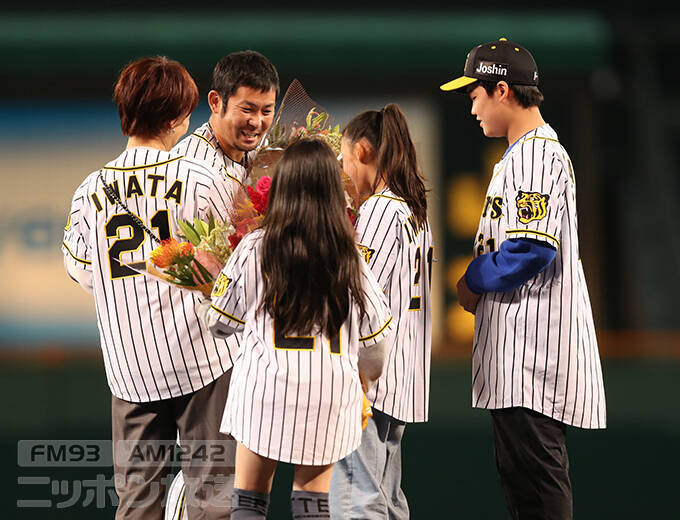 プロ野球 阪神対中日 引退セレモニーで、家族から花束を受け取る阪神・岩田稔投手(左から2人目)=2021年10月26日 甲子園球場 (代表撮影) 写真提供:産経新聞社