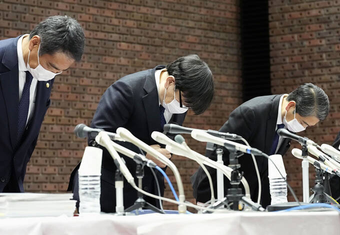前理事長の田中英寿容疑者が逮捕されたことなどを受け、記者会見で謝罪する日大の加藤直人学長(中央)ら=2021年12月10日夜、東京都千代田区 写真提供:共同通信社