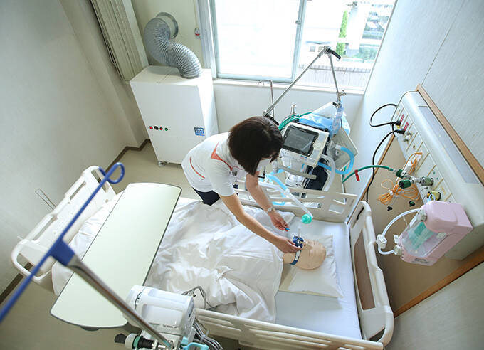 30日から新型コロナウイルス感染症の専門病院となる東京城東病院の病室。左奥は新たに設置された陰圧装置=2021年9月29日、東京都江東区 写真提供:時事通信