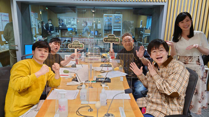 (前列)東京ホテイソン・ショーゴ、たける/(後列)サンドウィッチマン・富澤たけし、伊達みきお/(右)東島衣里アナウンサー