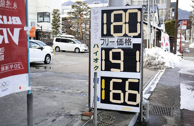 長野市内のガソリンスタンド。レギュラーガソリンの店頭価格は1リットル当たり180円と表示されていた=2022年1月26日午後 写真提供:共同通信社