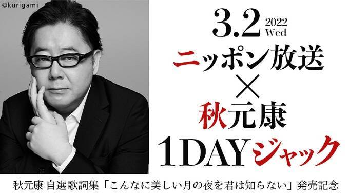 自選歌詞集「こんなに美しい月の夜は君は知らない」の発売を記念した「ニッポン放送×秋元康 1DAYジャック」は、3月2日(水)にニッポン放送の各番組にて実施。ラジオはニッポン放送AM1242/FM93で聴けるほか、スマホパソコンからはradikoを通じて聴くことができる。
