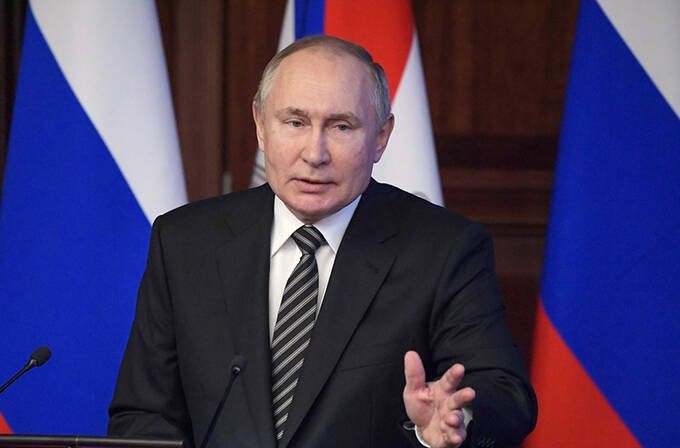 2021年12月21日、ロシア国防省幹部の会合で話すプーチン大統領(タス=共同) 写真提供:共同通信社