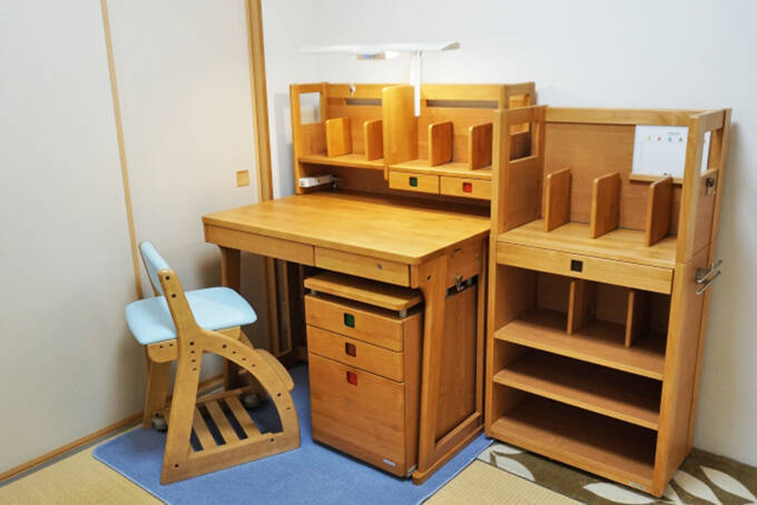例えば、棚の部分に鉛筆削りや時計が付いた机がありますが、こういった機能を学習机に初めて取り入れたのは、コクヨなのだそうです。
