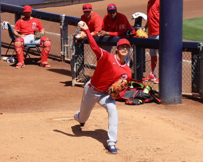 エンゼルスの大谷翔平投手は「1番・投手」でブルワーズ戦に出場。試合前は左翼側のブルペンで調整した 撮影日:2022年03月31日 写真提供:産経新聞社