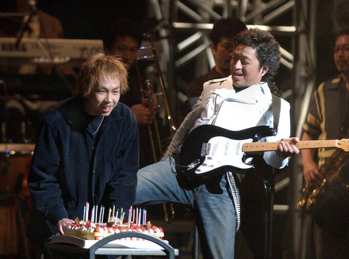 中村雅俊コンサート 全国ツアー最終日のこの日、長男で俳優の中村俊太(左)がケーキを持って誕生日のお祝いに駆けつけ笑顔の中村雅俊(右) 撮影日:2004年02月01日 撮影場所:東京都千代田区 東京国際フォーラム 写真提供:産経新聞社