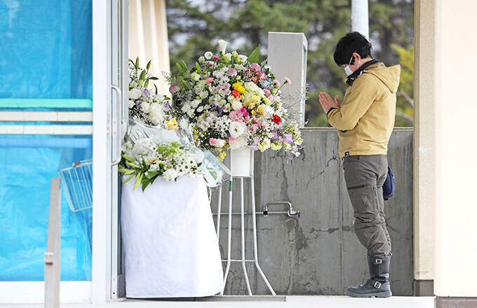【知床観光船不明】遺体安置所の斜里町B&G海洋センターで献花台に手を合わせる人の姿が見られた=2022年5月1日午前、北海道斜里町 写真提供:産経新聞社