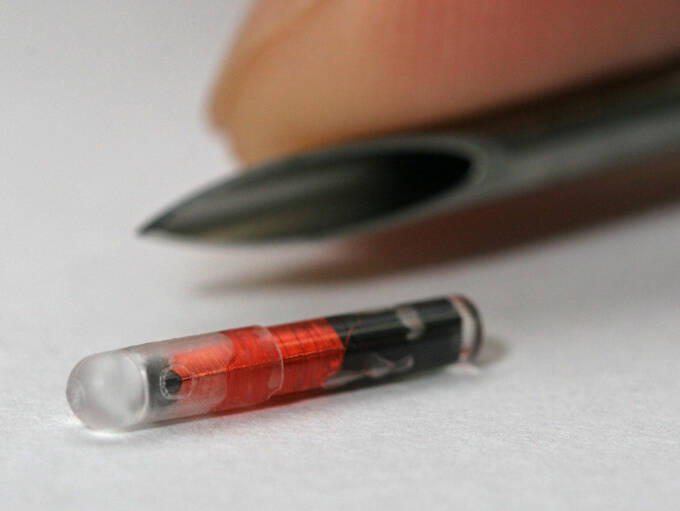 動物に埋め込むマイクロチップ。専用の注射器(写真後ろ)で注入する。 撮影日:2005年09月22日 写真提供:産経新聞社