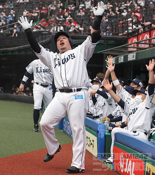 【プロ野球交流戦西武対広島】3回 西武・山川穂高が今季20号となる2点本塁打を放ちベンチ前で「どすこい!」=2022年6月12日 ベルーナドーム(西武ドーム) 写真提供:産経新聞社