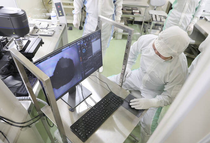 顕微鏡(左)でりゅうぐうの試料を調べる岡山大の研究者。