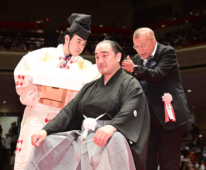 元関脇安美錦引退・安治川親方襲名披露大相撲 断髪式で落語家・笑福亭鶴瓶(右)にはさみを入れてもらう、元安美錦の安治川親方。行司は木村寿之介 =2022年05月29日 東京・両国国技館 (代表撮影) 写真提供:産経新聞社