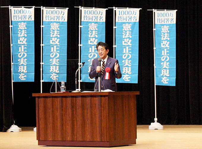 安倍晋三元首相は3日、山口市で講演し、9条に自衛隊を明記する憲法改正案について、ウクライナ情勢なども踏まえ「相手に日本の意思を見誤らせない大きな力になり、抑止力の強化にもつながる」との考えを示した。自民党山口県連が開いた憲法改正の早期実現に向けた総決起大会で述べた。=2022年4月3日、山口市 写真提供:産経新聞社