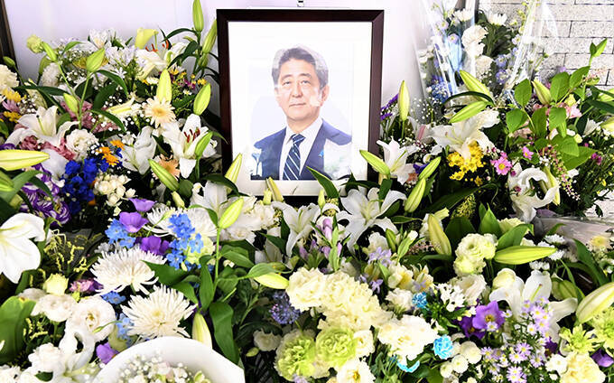 自民党の安倍晋三元首相を悼み、宮城県連事務所に設営された献花台=2022年7月11日午後、仙台市青葉区 写真提供:産経新聞社