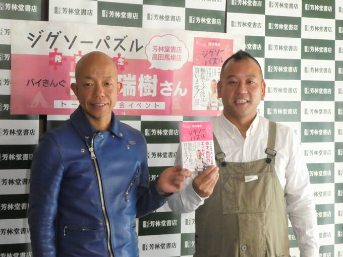 初エッセー「ジグソーパズル」の発売イベントを東京都内で行ったバイきんぐのボケ担当の西村瑞樹(右)とサプライズで駆け付けた相方の小峠英二 撮影日:2020年02月01日 写真提供:産経新聞社