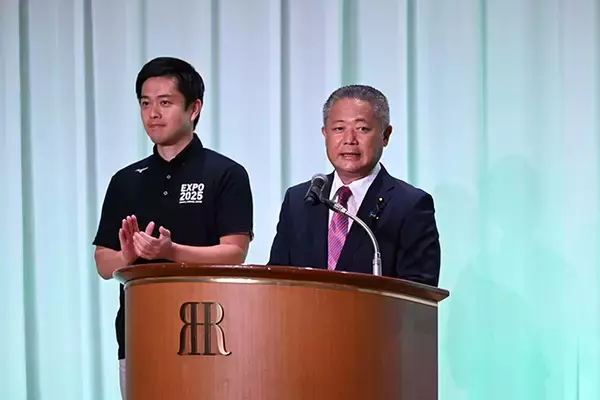 【「大阪維新の会」懇談会】「大阪維新の会」懇談会に登壇した大阪維新の会の吉村洋文代表、馬場伸幸氏=2022年9月15日、大阪市北区のリーガロイヤルホテル 写真提供:産経新聞社
