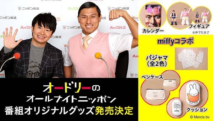 毎週土曜25時から放送中のニッポン放送『オードリーのオールナイトニッポン』の新しいオフィシャルグッズの販売がスタートした。春日の写真満載の「春日カレンダー」、miffyとのコラボ商品「おやすミッフィーちゃんパジャマ」「おやすミッフィーちゃんペンケース」「おやすミッフィーちゃんクッション」、そして「キン肉マン」とのコラボフィギュアが販売される。