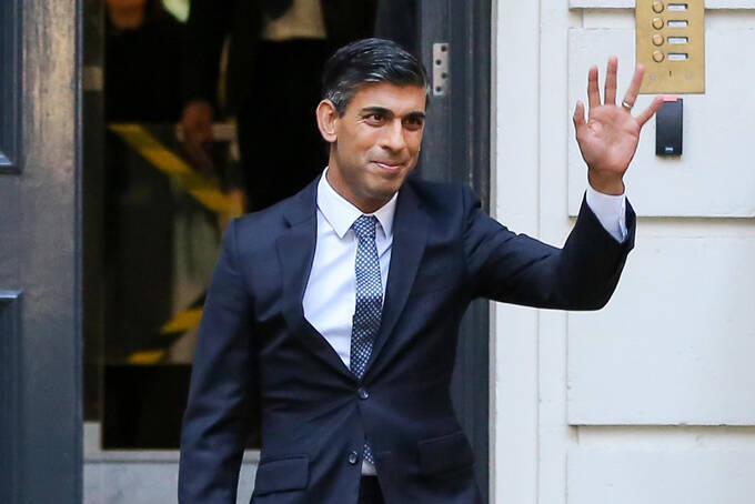 英与党保守党の新党首に選ばれ、党本部を出るスナク氏 撮影: 2022年10月24日、ロンドン(ゲッティ=共同)