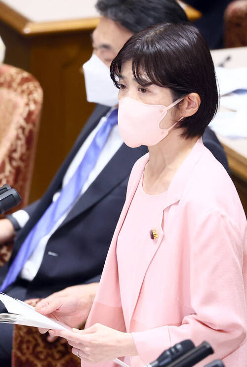 参院予算委で質問する立憲民主党の打越さく良氏。山際経済再生担当相に対し、世界平和統一家庭連合(旧統一教会)の信者かどうかをただす場面があった =2022年10月19日午前、国会・参院第1委員会室 写真提供:産経新聞社