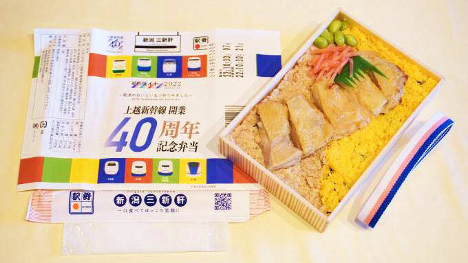 新潟の駅弁屋さん4社の共作による上越新幹線開業記念駅弁のトリを飾るのは、新潟三新軒の「上越新幹線開業40周年記念弁当」(1200円)。訊けば、弁当のなかも、「とりめし弁当」なんだそう。こちらの掛け紙も、40周年の文字が大きく入り、会社名が駅名標を模したデザインとなっていて、「Maxとき」の朱鷺色のゴムで掛け紙が留められています。記念弁当としては、今年(2022年)いっぱいの販売が予定されています。