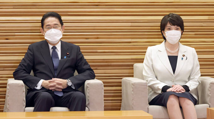 閣議に臨む岸田文雄首相、高市早苗経済安保相(右)=2022年12月13日、首相官邸 写真提供:産経新聞社