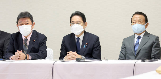 自民党役員会に臨む(左から)茂木敏充幹事長、岸田文雄首相、麻生太郎副総裁=2022年12月13日午前、東京・永田町の党本部 写真提供:産経新聞社