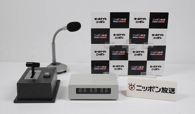 「スタジオマイク」「ニッポン放送特注カフ」 「スタジオ内デジタル時計」「マイク前パネル&卓上プレート」全4種・500円(税込)