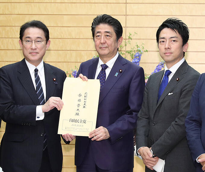 安倍晋三首相(中央)へ自民党人生100年時代戦略本部取りまとめの提言書を渡す岸田文雄本部長(左)と小泉進次郎事務局長(右)=2019年5月21日午後、首相官邸 写真提供:産経新聞社