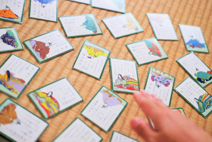 読み手が読む上の句を聞き、相手よりも先に札を取ります。相手の陣地にある札を取った場合は、自分の陣地にある札を相手の陣地に送ります。これをくり返し、最終的に自分の陣地の札がなくなった人が勝ちとなります。短歌を覚える記憶力はもちろん、とっさの判断力や瞬発力など、さまざまな能力が求められます。