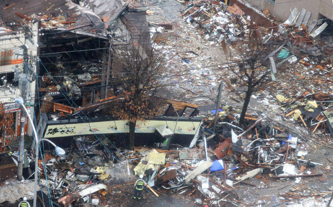 <札幌不動産仲介店舗ガス爆発事故>爆発事故から一夜明けた現場。店ががれきとなっていた=2018年12月17日午前8時41分、札幌市豊平区 写真提供:産経新聞社