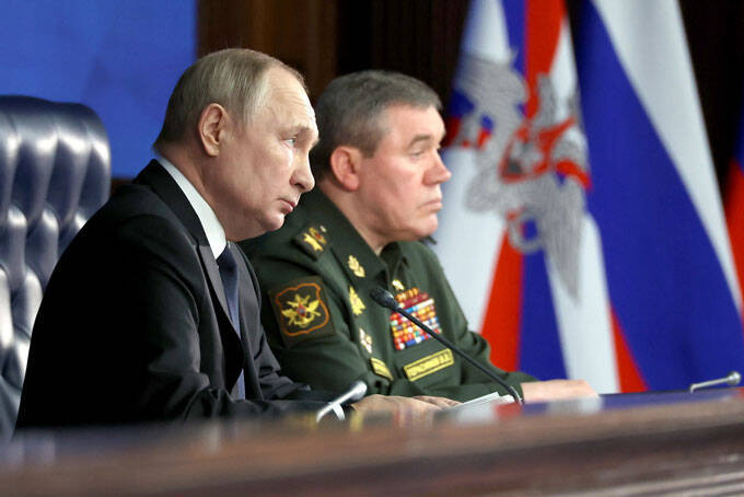 ロシア国防省の会合に出席したプーチン大統領(左)とゲラシモフ参謀総長=2022年12 月、モスクワ(タス=共同)