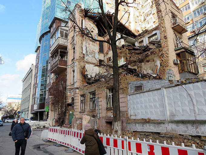 10月の露軍の攻撃で破壊された建物。周囲にはいまもがれきが散乱しており、犠牲者を悼む花も手向けられていた=2022年12月28日、キーウ市街 写真提供:産経新聞社