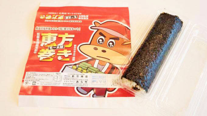 節目の時といえば、暦の上で季節を分ける「節分」。豆まきで鬼を追い払う風習に加え、近年は節分の日に、その年の縁起の良い方角(恵方)を向いて太巻寿司(恵方巻き)を丸かぶりする風習も、すっかり全国区となりました。全国の駅弁屋さんも、節分の前後に恵方巻きを限定販売しています。今回は1月28日から2月3日まで販売中の松阪駅弁・新竹商店の「松阪名物黒毛和牛 モー太郎恵方巻き」(1000円)をいただきました。