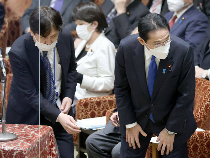 衆院予算委に臨む岸田文雄首相と荒井勝喜首相秘書官(左)=2023年1月31日午後、衆院第1委員室 写真提供:産経新聞社
