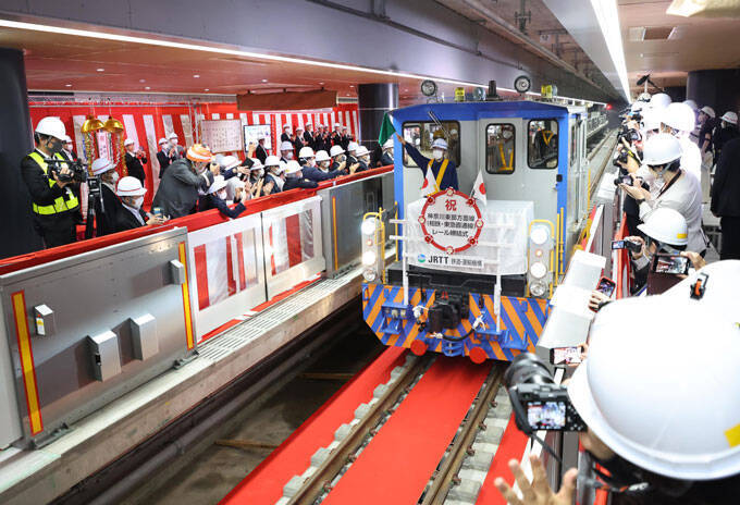 <相鉄と東急レールつながる 「悲願」直通線、新横浜駅で締結式>レールが繋がり、確認のため線路を走るモーターカー=2022年07月22日午後、横浜市港北区 写真提供:産経新聞社