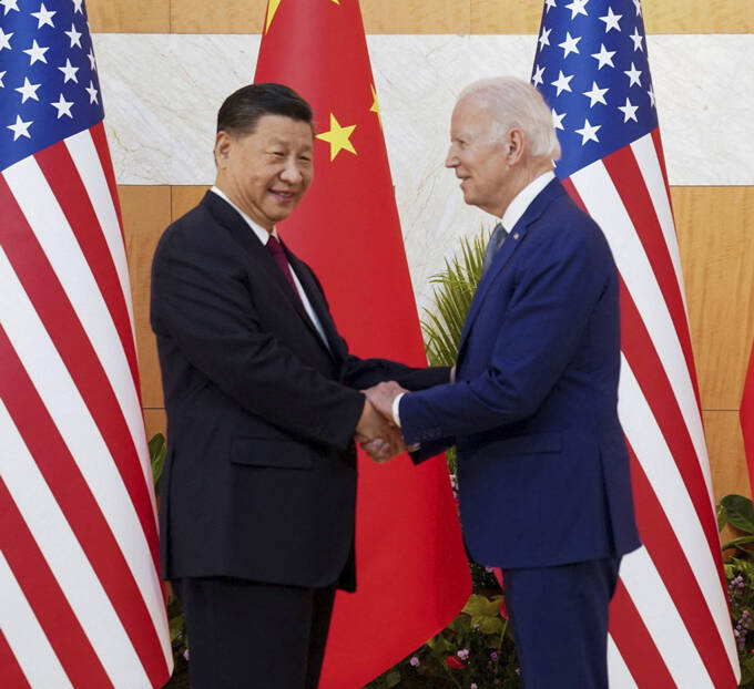 インドネシアのバリ島で、握手する中国の習近平国家主席(左)とバイデン米大統領 2022年11月14日 (ロイター=共同) 写真提供:共同通信社